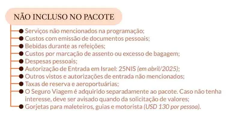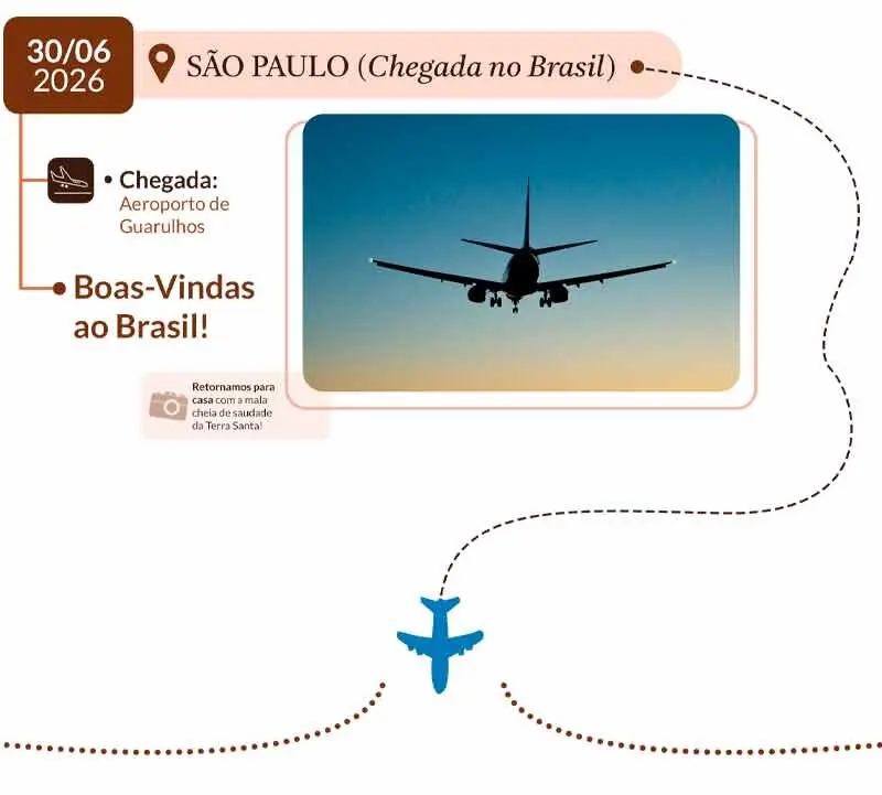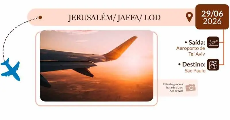 14º DIA – JERUSALÉM / JAFFA / LOD: Em horário acordado, saída em direção ao aeroporto de Tel Aviv/Lod, para embarque com destino a São Paulo.