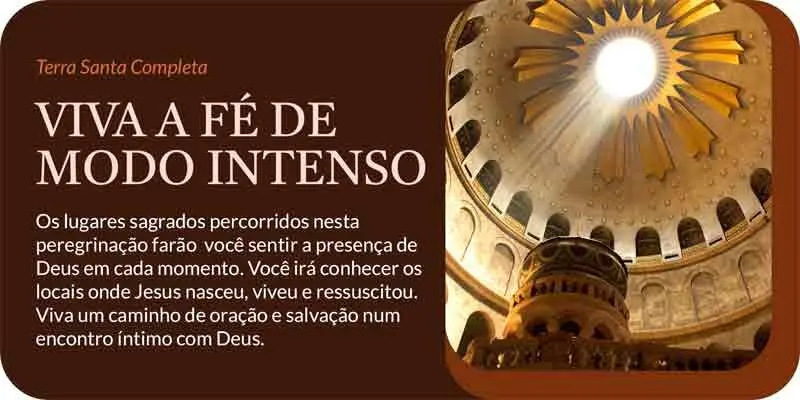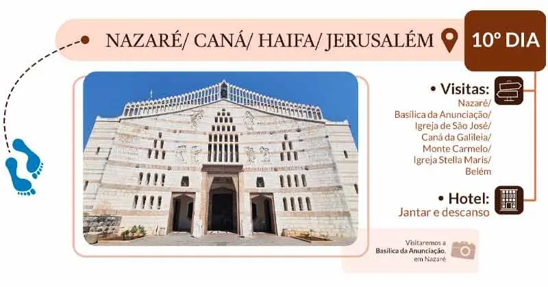 10º DIA – NAZARÉ / CANÁ / HAIFA / JERUSALÉM:Visita à Nazaré e a Basílica da Anunciação, onde o anjo Gabriel visitou Maria. Possibilidade de visita aos restos da antiga carpintaria na Igreja de São José. Seguindo à Caná da Galiléia, local do primeiro milagre de Jesus. Renovação do sacramento do matrimônio. Seguiremos em direção à Haifa onde visitaremos o Monte Carmelo e à Igreja Stella Maris, onde se encontra a gruta do Profeta Elias. Prosseguiremos então para Belém para jantar e descanso.