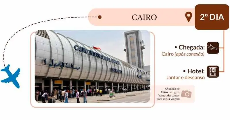 2º DIA – CAIRO:Chegada ao aeroporto, recepção e traslado até o hotel para pernoite.