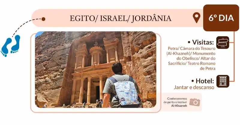 6º DIA – EGITO / ISRAEL / JORDÂNIA: Após o café da manhã, ida a fronteira com Israel e depois à Jordânia. A viagem continua com ida para à antiga capital dos Nabateus e visita à maior atração da Jordânia: Petra – um espetacular desfiladeiro que termina na Câmara do Tesouro. Ainda poderão ser visitados: o Obelisco, o Altar do Sacrifício e o Teatro Romano. Hotel, jantar e descanso.