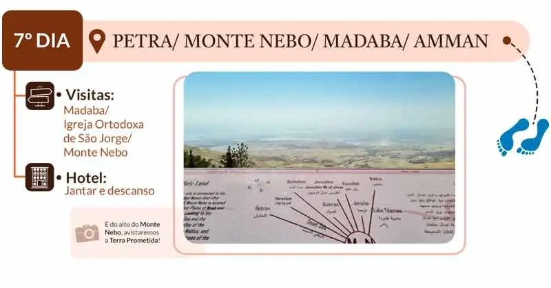 7º DIA – PETRA / MONTE NEBO / MADABA / AMMAN: Café da manhã seguido de visita a Madaba, passando pela igreja ortodoxa de São Jorge. Visita ao Monte Nebo, local da morte de Moisés e vista panorâmica da Terra Prometida. Em Amman, hotel, jantar e pernoite.