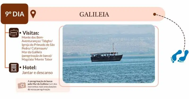 9º DIA – GALILEIA:Café da manhã. Ida ao Monte das Bem Aventuranças, a Tabgha, e visita a igreja do Primado de São Pedro. Segue-se para Cafarnaum, com visita a sinagoga onde Jesus estabeleceu seu ministério. Almoço, “peixe de São Pedro”. Peregrinação de barco pelo Mar da Galileia. Visita de Magdala. Monte Tabor, local da transfiguração de Jesus. Hotel, jantar e descanso.