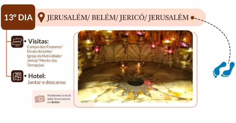 13º DIA – JERUSALÉM / BELÉM / JERICÓ / JERUSALÉM:Após o café da manhã, ida ao Campo dos Pastores, a Gruta do Leite, e a Igreja da Natividade. Tempo livre para compras no comércio local. Logo após, segue-se até Jericó, visitando o Sicômoro de Zaqueu. Ida ao Monte das Tentações, onde Jesus foi provado. Retorno ao hotel, jantar e descanso.