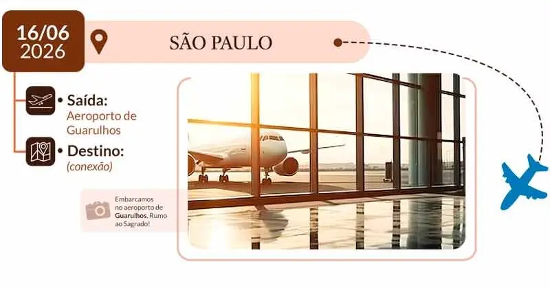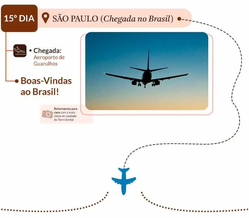 15º DIA – SÃO PAULO (Chegada no Brasil): Chegada ao aeroporto de Guarulhos. Boas-Vindas à casa!
