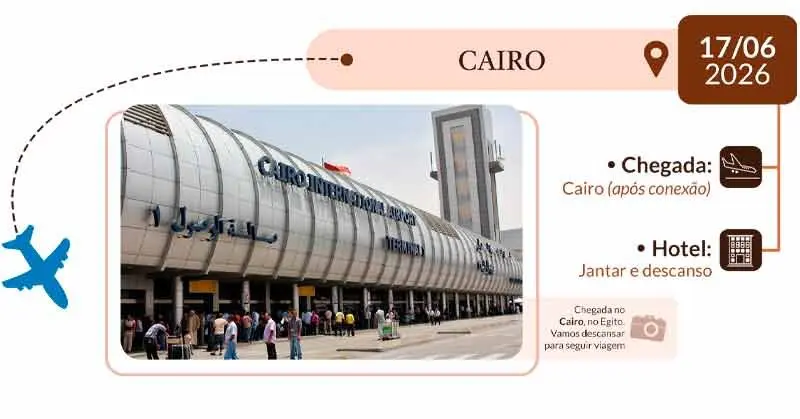 2º DIA – CAIRO: Chegada ao aeroporto, recepção e traslado até o hotel para pernoite.