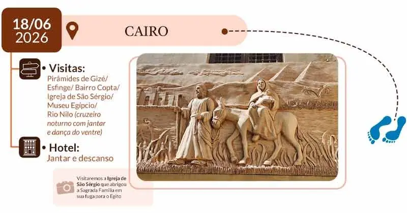 3º DIA – CAIRO: Café da manhã. Saída para almoço e visita às pirâmides de Keops, Kefren, Micerinos e à Esfinge. Jantar e pernoite no hotel. Visita ao bairro Copta, visita a Igreja de São Sérgio. Visita ao museu Egípcio. À noite, desfrutaremos de um cruzeiro no Rio Nilo com jantar e uma apresentação de dança do ventre. Jantar e hospedagem.