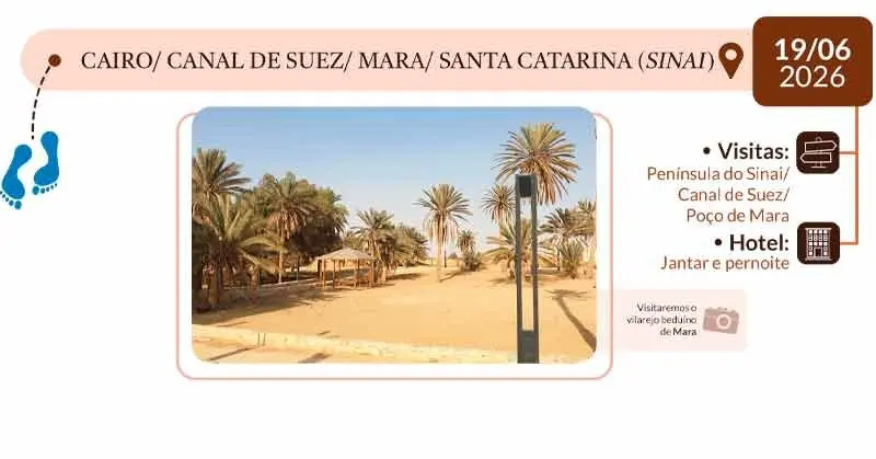 4º DIA – CAIRO / CANAL DE SUEZ / MARA / SANTA CATARINA (SINAI): Café da manhã. Em seguida, visita à Península do Sinai, Canal de Suez e vilarejo beduíno de Mara onde Moisés transformou a água amarga em água potável. Chegada ao hotel em Santa Catarina (Sinai). Alojamento, jantar e descanso.