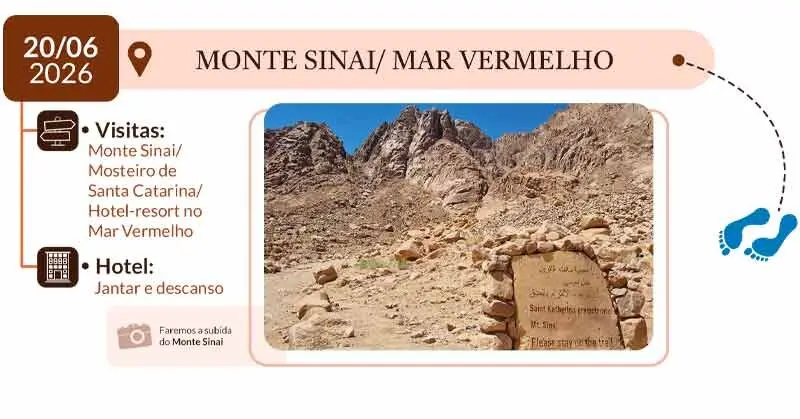 5º DIA – MONTE SINAI / MAR VERMELHO: Iremos ao Monte Sinai, onde Moisés recebeu os Dez Mandamentos. Retorno ao hotel para café da manhã. Seguiremos para visita ao Mosteiro de Santa Catarina – o mais antigo mosteiro cristão em uso. Seguiremos para um hotel-resort no Mar Vermelho para jantar e pernoite.