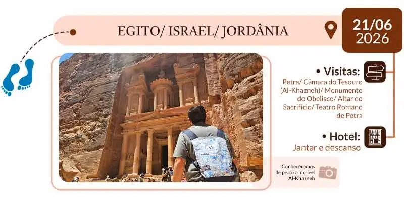 6º DIA – EGITO / ISRAEL / JORDÂNIA: Após o café da manhã, ida a fronteira com Israel e depois à Jordânia. A viagem continua com ida para à antiga capital dos Nabateus e visita à maior atração da Jordânia: Petra – um espetacular desfiladeiro que termina na Câmara do Tesouro. Ainda poderão ser visitados: o Obelisco, o Altar do Sacrifício e o Teatro Romano. Hotel, jantar e descanso.