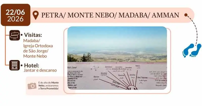 7º DIA – PETRA / MONTE NEBO / MADABA / AMMAN: Café da manhã seguido de visita a Madaba, passando pela igreja ortodoxa de São Jorge. Visita ao Monte Nebo, local da morte de Moisés e vista panorâmica da Terra Prometida. Em Amman, hotel, jantar e pernoite.