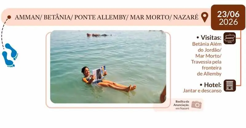 8º DIA – AMMAN / BETÂNIA / PONTE ALLEMBY / MAR MORTO / NAZARÉ: Após o café da manhã no hotel, saída para visitar Betânia além do Jordão, lugar onde Jesus foi batizado por João Batista. Seguimos até o Mar Morto. Final do dia, passagem pela fronteira de Allemby e continuação a Nazaré.