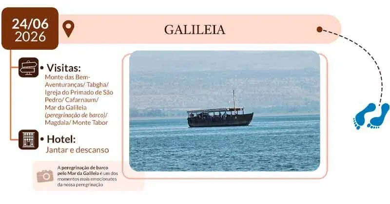 9º DIA – GALILEIA: Café da manhã. Ida ao Monte das Bem Aventuranças, a Tabgha, e visita a igreja do Primado de São Pedro. Segue-se para Cafarnaum, com visita a sinagoga onde Jesus estabeleceu seu ministério. Almoço, “peixe de São Pedro”. Peregrinação de barco pelo Mar da Galileia. Visita de Magdala. Monte Tabor, local da transfiguração de Jesus. Hotel, jantar e descanso.