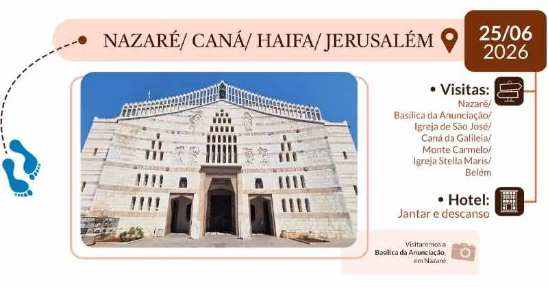 10º DIA – NAZARÉ / CANÁ / HAIFA / JERUSALÉM: Visita à Nazaré e a Basílica da Anunciação, onde o anjo Gabriel visitou Maria. Possibilidade de visita aos restos da antiga carpintaria na Igreja de São José. Seguindo à Caná da Galiléia, local do primeiro milagre de Jesus. Renovação do sacramento do matrimônio. Seguiremos em direção à Haifa onde visitaremos o Monte Carmelo e à Igreja Stella Maris, onde se encontra a gruta do Profeta Elias. Prosseguiremos então para Belém para jantar e descanso.