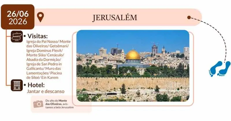 11º DIA – JERUSALÉM: Após o café da manhã, saída rumo à Igreja do Pai Nosso e ao Monte das Oliveiras. Ida ao Getsêmani, onde Cristo foi preso, e à Igreja de Dominus Flevit. Visita ao topo do Monte Sião, ao Cenáculo e a Abadia da Dormição. Continuação do passeio para co- nhecer a Igreja de GalliCantu e segue-se rumo ao Muro das Lamentações. Terminamos o dia conhecendo a Piscina de Silóe e Ein Karen. Hotel, jantar e descanso.