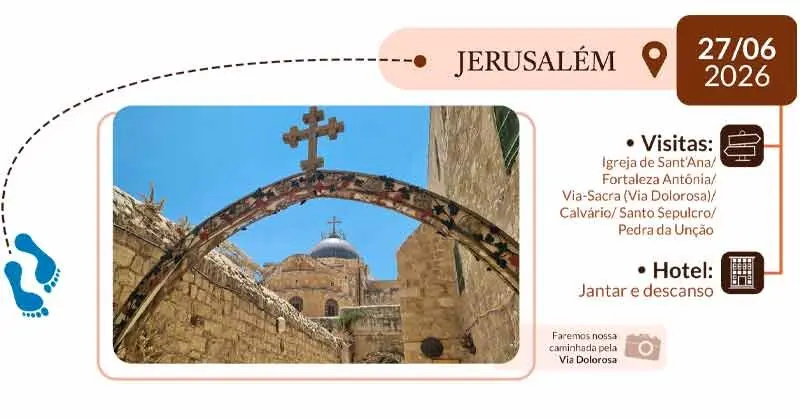 12º DIA – JERUSALÉM: Café da manhã. Visita a Igreja de Sant´Anna, casa dos avós de Jesus. Via-Sacra pela Fortaleza de Antônia, onde Jesus foi preso e julgado. Percurso pelas 14 estações, chegando ao Calvário. Momento de oração no Santo Sepulcro e na pedra onde Jesus foi embalsamado. Restante do dia livre para compras. Retorno ao hotel para jantar e descanso.