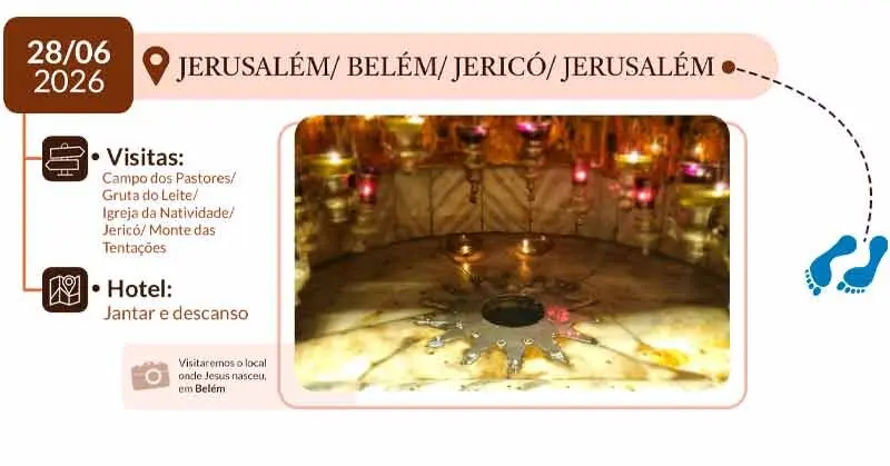 13º DIA – JERUSALÉM / BELÉM / JERICÓ / JERUSALÉM: Após o café da manhã, ida ao Campo dos Pastores, a Gruta do Leite, e a Igreja da Natividade. Tempo livre para compras no comércio local. Logo após, segue-se até Jericó, visitando o Sicômoro de Zaqueu. Ida ao Monte das Tentações, onde Jesus foi provado. Retorno ao hotel, jantar e descanso.
