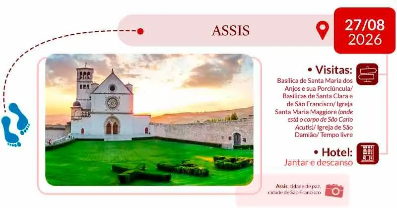 27/08/2026: AssisApós café da manhã dia dedicado a visita da cidade de São Francisco de Assis. Conheceremos a famosa Basílica de Santa Maria Dos Anjos e sua Porciúncula, as Basílicas de Santa Clara e de São Francisco. Visita a Igreja Santa Maria Maggiore, onde está exposto de forma permanente o corpo de São Carlo Acutis. Teremos ainda tempo de visitar a Igreja de São Damião.  Tempo livre e acomodação e jantar no hotel.
